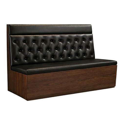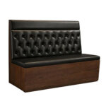 Classic restaurant booth featuring a black vinyl seat and button-tufted back, paired with a rich walnut veneer base for a timeless, upscale appearance. The deep tufting adds traditional character and supportive comfort, while the smooth seat ensures easy maintenance in busy dining environments. Built for commercial durability, this booth is ideal for restaurants, cafés, and hospitality spaces. Available in 48″, 60″, and 72″ lengths to accommodate a variety of floor plans and seating configurations.