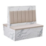 Cream Vinyl Booth with Vertical Channel Back and Marble-Look Melamine Frame offers a refined balance of comfort and modern elegance, making it an excellent choice for restaurants and other commercial spaces. At first glance, the vertical channel stitched backrest introduces a clean, structured aesthetic; meanwhile, the smooth cream vinyl upholstery adds a warm, inviting feel. In addition, the marble-look melamine frame delivers a luxurious appearance while remaining durable and easy to maintain. Furthermore, the generously padded seat ensures lasting comfort for guests during extended dining periods. Not only does this booth enhance visual appeal, but it also supports high-traffic performance in busy hospitality environments. Equally important, the design integrates seamlessly into both contemporary and upscale interiors. Moreover, this booth is available in 48″, 60″, and 72″ lengths, allowing flexible layout planning; similarly, a double-seat option is offered for larger seating configurations. Overall, this booth combines style, durability, and versatility, making it a smart and sophisticated seating solution for professional commercial settings.