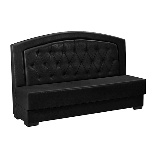 Indoor black upholstered booth featuring a classic button-tufted back and a smooth, padded seat for a refined and timeless look. The gently arched backrest enhances visual appeal while providing supportive comfort for guests. Upholstered in durable, easy-to-maintain material, this booth is designed to withstand the demands of high-traffic restaurant and commercial environments. Available in 48″, 60″, and 72″ lengths, along with a double-seat option, this booth offers flexible configuration options to suit a variety of dining layouts in restaurants and other commercial spaces.