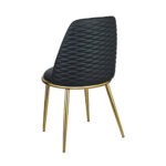 This indoor dining chair features a sleek black vinyl seat paired with a distinctive quilted wave pattern on the outer back, creating a modern and eye-catching look. The smooth inner seat offers comfortable support, while the textured outer shell adds visual depth and a touch of contemporary style. Its slim gold metal frame provides a refined contrast and ensures durable, stable performance in busy restaurant or commercial settings. Designed to complement a wide range of interiors, this chair works well in dining areas, lounges, cafés, and hospitality environments. The combination of black upholstery and gold metal accents delivers a sophisticated appearance that elevates both modern and upscale spaces. Furnishings a restaurant is what ARTeFAC specializes from year 2004.