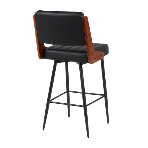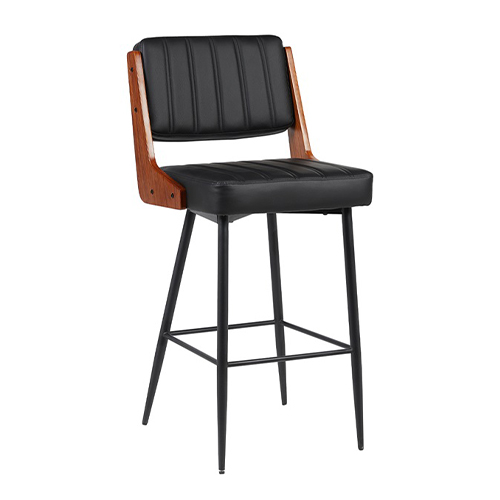 Indoor wood grain steel chair featuring a rich brown finish that delivers the warmth of wood with the strength and durability of steel. The padded vinyl seat and back provide comfort and support, with vertical channel detailing that adds subtle texture and a refined touch. Available in black or cream vinyl, this chair offers versatile styling options to complement a variety of restaurant interiors. Designed for commercial performance, it is offered in both standard and bar height to accommodate different dining and bar setups. Ideal for restaurants, cafés, and other commercial spaces seeking a blend of durability, comfort, and modern industrial style. Furnishings a restaurant is what ARTeFAC specializes from year 2004.