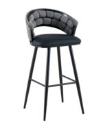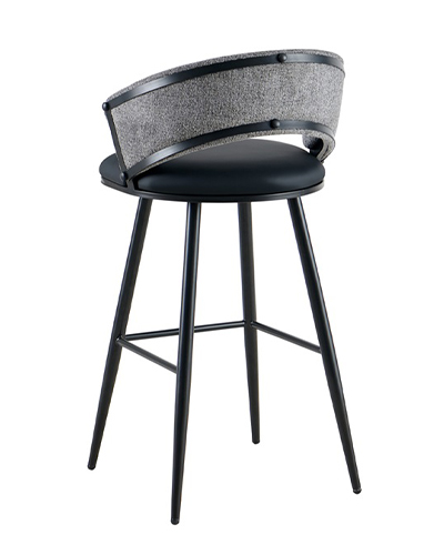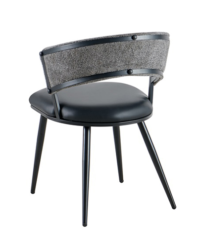 This indoor metal dining chair combines contemporary design with comfort and durability, making it ideal for restaurants, bars, and other commercial spaces. It features a gracefully curved backrest upholstered in soft textured fabric that offers ergonomic support, complemented by a padded vinyl seat for easy cleaning and long-lasting comfort. The sturdy black metal frame with tapered legs provides excellent stability while enhancing its modern aesthetic. Available in both standard dining and bar height options, this chair brings a cohesive and stylish look to any dining or lounge environment. Furnishings a restaurant is what ARTeFAC specializes from year 2004.