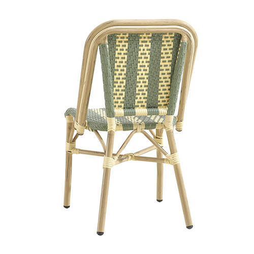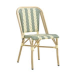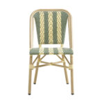 Designed for both indoor and outdoor use, this bamboo-style aluminum bistro chair features a lightweight yet durable frame with a natural bamboo finish. The seat and back are woven in a green and cream pattern, adding a fresh, classic café-inspired look that enhances patios, dining areas, and hospitality spaces. Built for commercial environments, the chair offers weather-resistant materials, sturdy construction, and comfortable support, making it a practical and stylish seating option for restaurants, cafés, and other high-traffic venues. Furnishings a restaurant is what ARTeFAC specializes from year 2004.