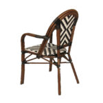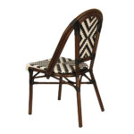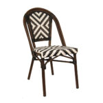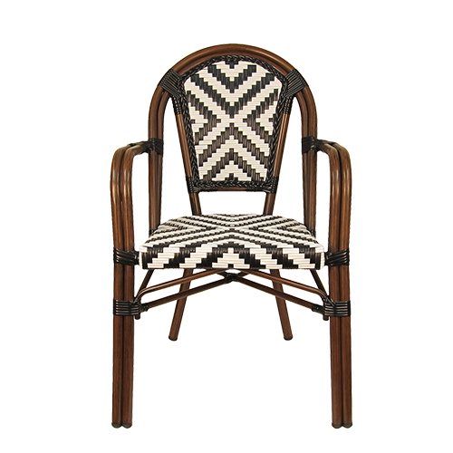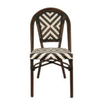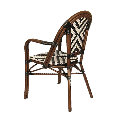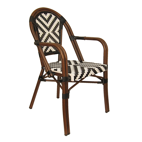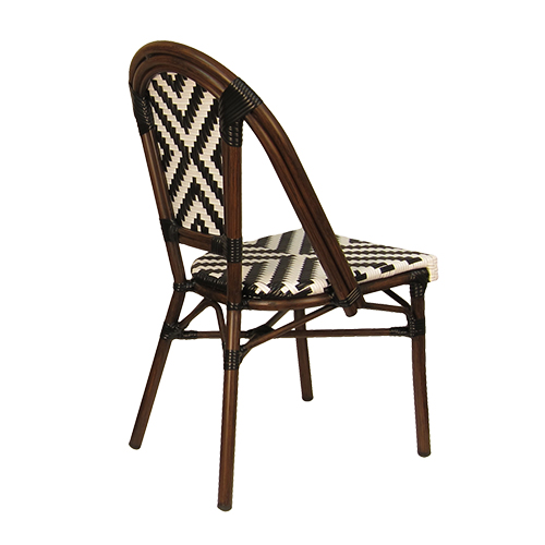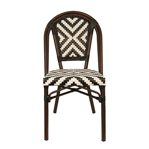 The Indoor/Outdoor Bamboo-Style Stackable Aluminum Chair combines classic café-inspired design with modern durability, making it an excellent seating solution for restaurants, patios, cafés, and other commercial dining spaces. Featuring a bamboo-style aluminum frame, the chair offers the timeless look of natural rattan while providing the strength, lightweight construction, and weather resistance of aluminum. The white and black poly woven seat and back create a striking geometric pattern while delivering comfortable and supportive seating. Designed with practicality and versatility in mind, this chair features a stackable design for convenient storage and space management. Its elegant café-style aesthetic and durable construction allow it to integrate seamlessly into contemporary patios, European bistro settings, or casual dining spaces. Furnishings a restaurant is what ARTeFAC specializes from year 2004.