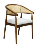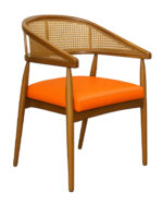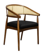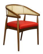 R-919A-32 Mid-Century Wooden Armchair with Rattan Backrest and Brown Vinyl Seat