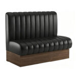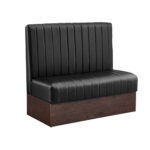 This modern booth showcases sleek black vinyl upholstery that delivers a bold, contemporary look while remaining easy to clean. Moreover, the vertical channel detailing on both the seat and back adds visual depth and enhances seating comfort. The walnut melamine base provides a warm contrast and ensures durability in high-traffic environments. Additionally, the clean-lined silhouette allows it to blend seamlessly into a variety of interior styles. Overall, this booth is a practical and stylish seating solution for restaurants and other commercial spaces seeking long-lasting performance and refined design.