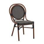 Elevate indoor and outdoor dining areas with this elegant aluminum patio chair, designed with durability and style in mind. The chair features a charcoal-toned poly-weave seat and backrest, paired with a warm walnut-finish aluminum frame that offers the look of natural rattan while maintaining excellent weather resistance. Its curved silhouette adds a refined touch, while the woven back provides comfort and breathability. Ideal for restaurants, patios, cafés, and other commercial environments seeking long-lasting, easy-to-maintain seating. Furnishings a restaurant is what ARTeFAC specializes from year 2004.
