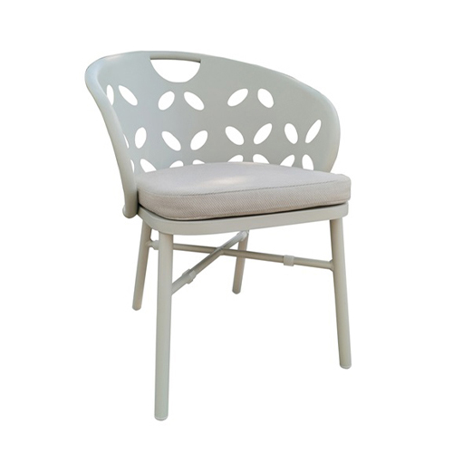 This patio chair brings a modern, breezy style to any commercial space. It features a sculpted cutout backrest that adds visual interest while keeping the design light and airy. The frame is crafted from durable aluminum, making it suitable for both indoor and outdoor use. A beige seat cushion enhances comfort and offers a soft contrast to the smooth frame. The chair is available in standard and bar height, giving you flexibility for dining areas, patios, and bar setups. Its lightweight build allows for easy movement and layout changes, while the sturdy construction supports everyday commercial use. Ideal for restaurants, cafés, patios, poolside lounges, and mixed-use spaces. Furnishings a restaurant is what ARTeFAC specializes from year 2004.