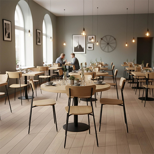 The Scandinavian Style Oak Chair combines simplicity and functionality, making it a perfect addition to restaurants and commercial spaces. Its clean lines and minimalist form create a timeless aesthetic that complements a wide range of interiors. Crafted from natural oak, the seat and backrest offer warmth and organic character. Meanwhile, the black metal legs provide a sleek contrast while ensuring strength and stability. In addition, the brass hardware accents introduce a subtle touch of sophistication, enhancing the overall design. Designed with practicality in mind, this chair is stackable, allowing for easy storage and efficient space management. Therefore, it is especially suitable for high-traffic environments where flexibility is essential. Overall, this chair delivers a balanced combination of durability, comfort, and modern Scandinavian design, making it a reliable and stylish seating solution. Furnishings a restaurant is what ARTeFAC specializes from year 2004.