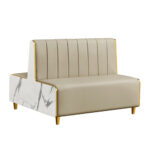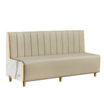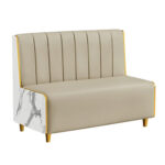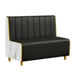 This upscale channel-back booth seating enhances modern restaurant interiors with a clean, sophisticated presence. First, it features a durable melamine frame paired with elegant marble-accent side panels for a premium look. Additionally, the smooth vinyl upholstery offers easy maintenance and long-lasting performance. Meanwhile, the vertical channel-back design provides structured support and a refined, tailored appearance. For added comfort, high-density cushioning supports guests during extended seating periods. Furthermore, the booth is available in classic black or soft cream vinyl to complement a wide range of interiors. Finally, it comes in 48″, 60″, and 72″ lengths and includes a double-seat option, making it ideal for restaurants and other commercial spaces.