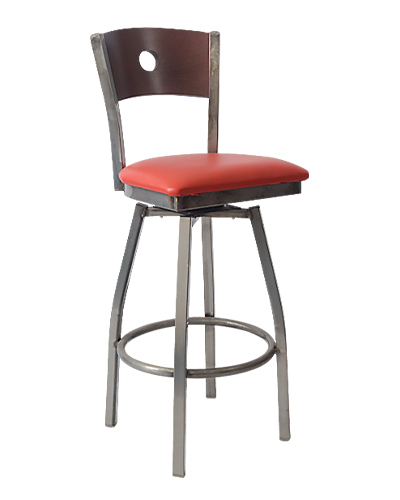 Add a touch of industrial charm and modern durability with the Veneer Circle Hole Punch Back Clear Coat Metal Chair. Designed with a sturdy clear coat metal frame, this chair features a distinctive circle cut-out backrest paired with a veneer finish for a sleek yet warm look. The seat is available in vinyl, solid wood, or veneer options, ensuring both comfort and versatility for your space. Perfect for restaurants, bars, cafés, and other commercial spaces, this chair is offered in Standard, Bar Height, and Swivel Bar Height styles to meet various seating needs. Its durable construction guarantees long-lasting use, while multiple variations allow you to customize the look to complement your interior design. Furnishings a restaurant is what ARTeFAC specializes from year 2004.
